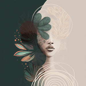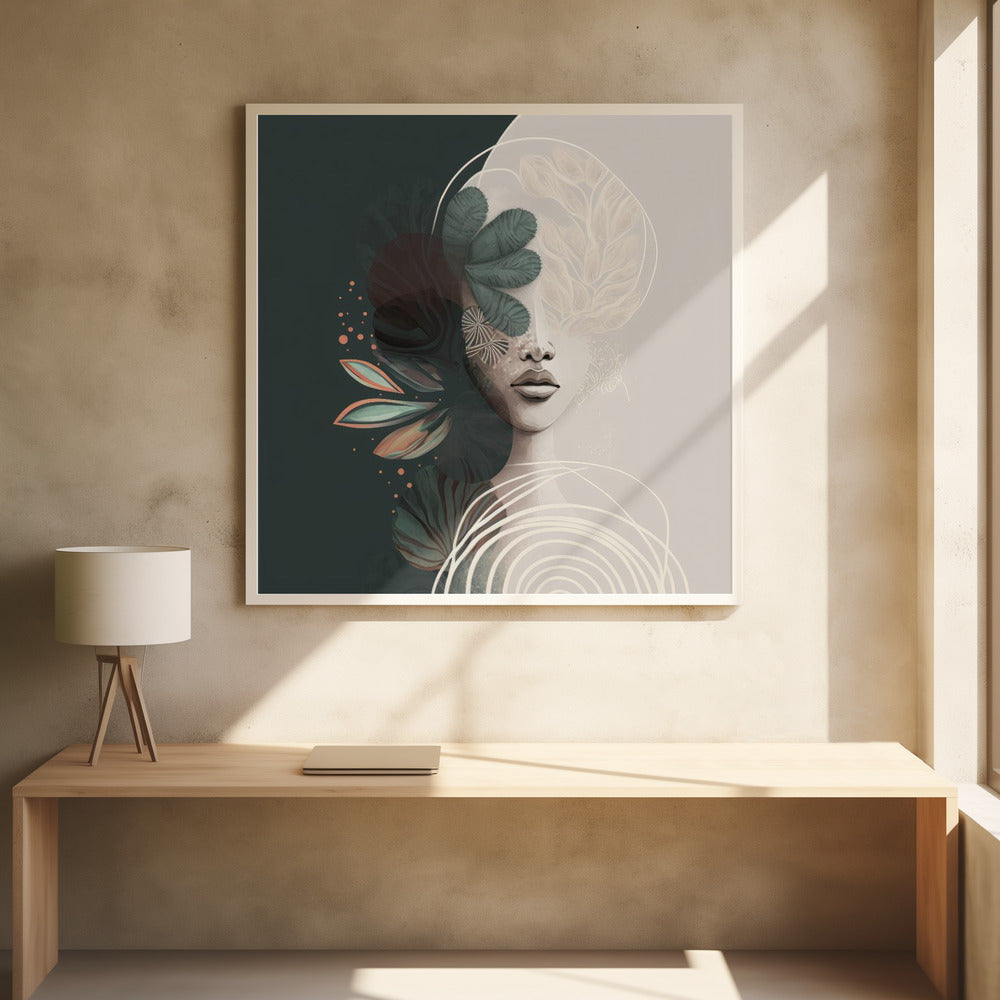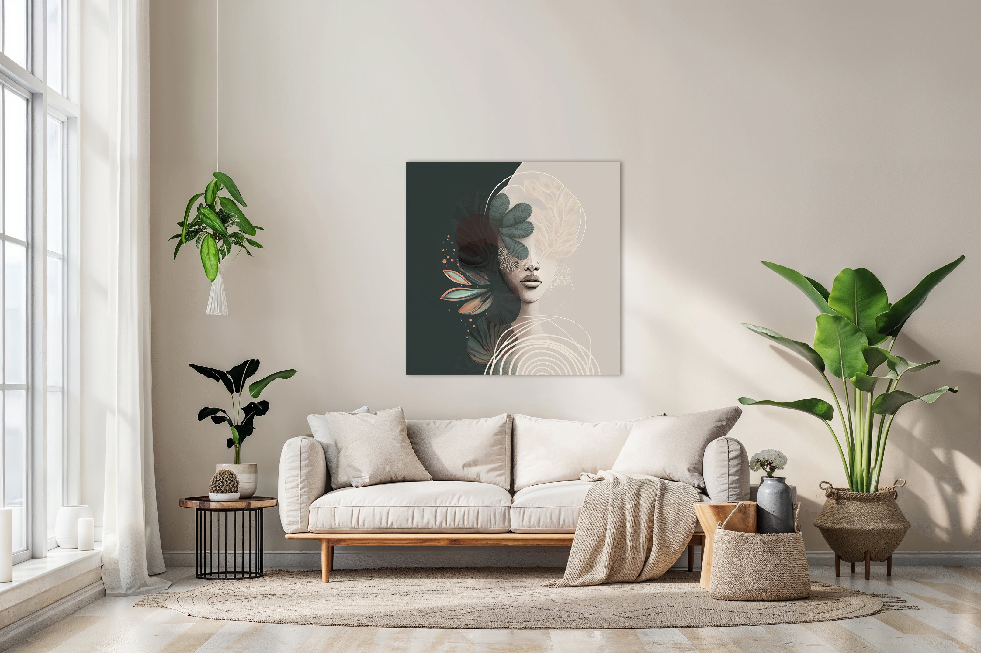 This painting exudes a warm, contemporary atmosphere with abstract lines and beautiful botanical details in beige and green tones. Ideal for those who appreciate multiculturalism, femininity, and the beauty of nature on the wall. This wall decoration fits perfectly with modern and botanical interiors.