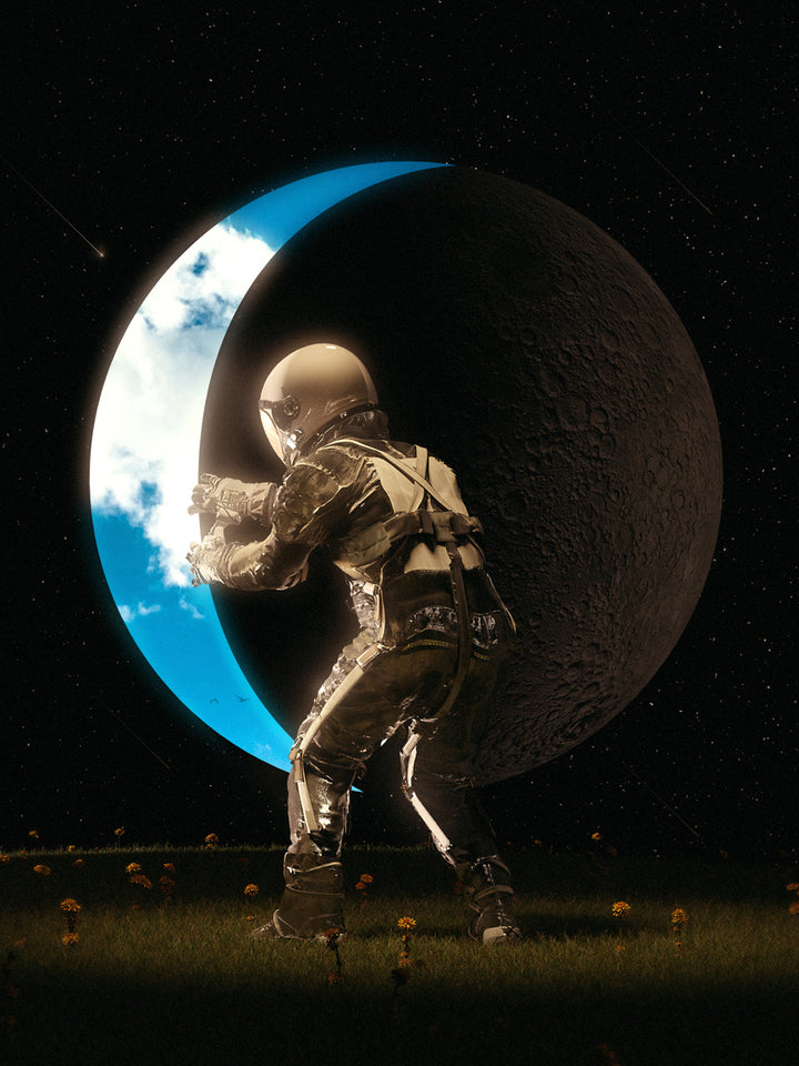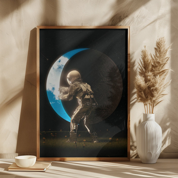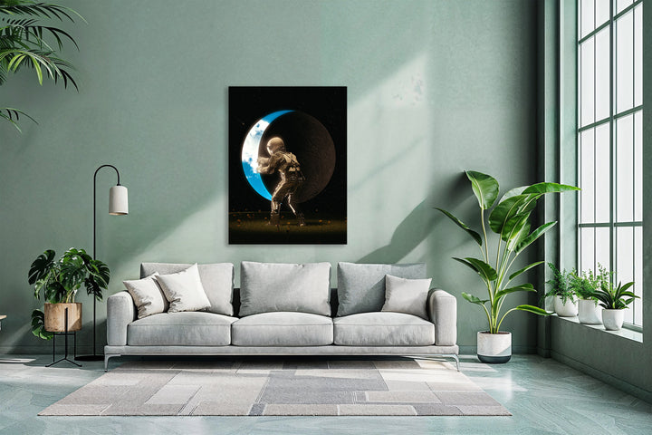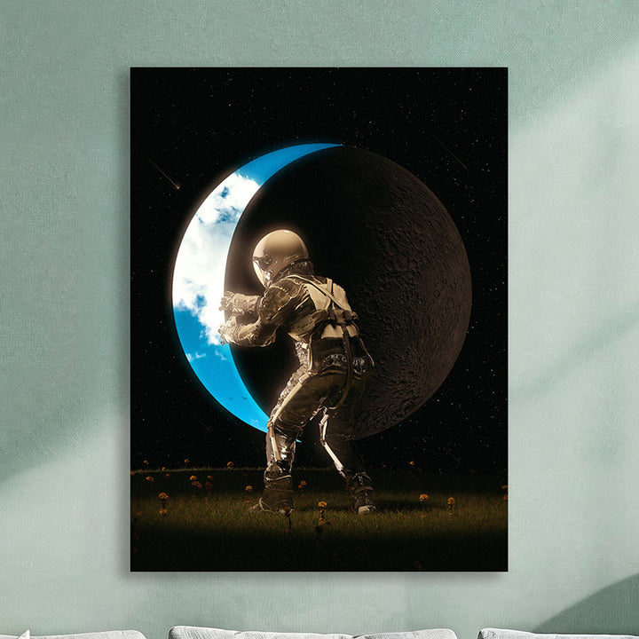 Deze wanddecoratie voert je mee naar een dromerige ruimte vol mysterie en avontuur, perfect voor liefhebbers van moderne kunst en sci-fi sferen. Met zijn krachtige kleuren en intrigerende details past het schilderij prachtig in een eigentijds interieur of een stoer kantoor.