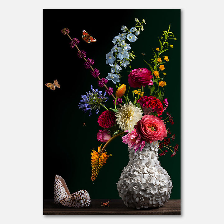 The modern version of the beautiful Bloemstilleven Balthasar van der Ast. Beautiful vase with flowers insects (including butterflies, cross spider, caterpillar, bees) and shells (cone marmoreus). "Flowers Still life" is a must have to be able to look at every day.