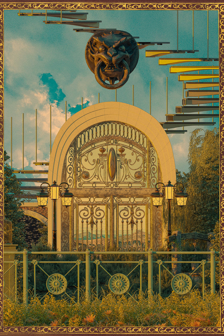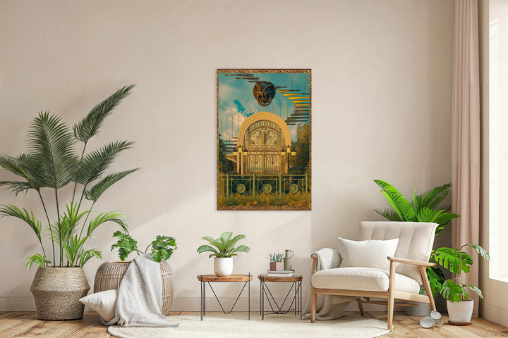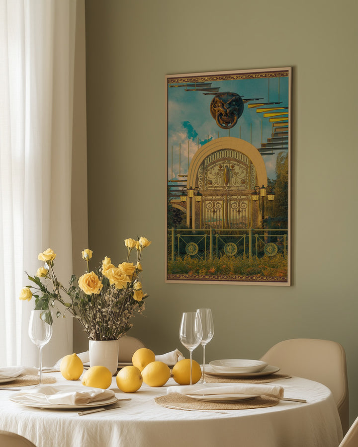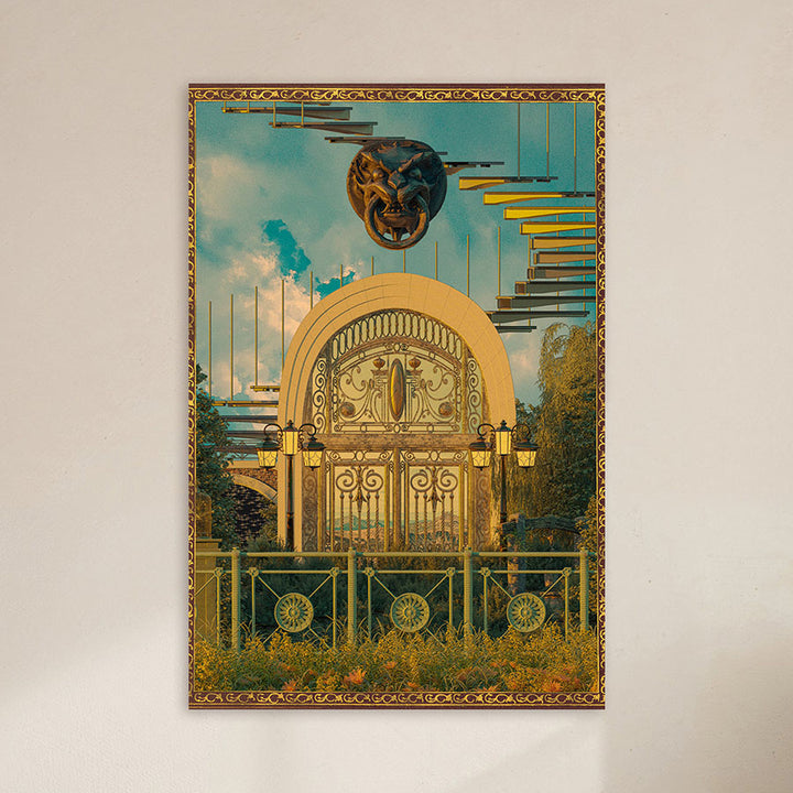 This wall decoration immediately catches the eye with its surreal mix of clouds, a gate, and futuristic elements. Perfect for lovers of creative and bold interiors, it adds a mysterious and dreamy atmosphere to modern and retro spaces. Ideal for a contemporary or retro-futuristic interior.