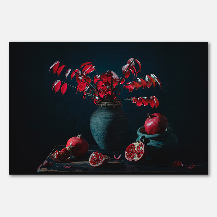 This wall decoration radiates the warm colors of autumn and brings a cozy touch to any room. Featuring a beautiful still life of colorful leaves, a vase, and a pomegranate, this painting fits perfectly in a modern or classic interior. This painting brings the feeling of a cozy autumn day into your home.