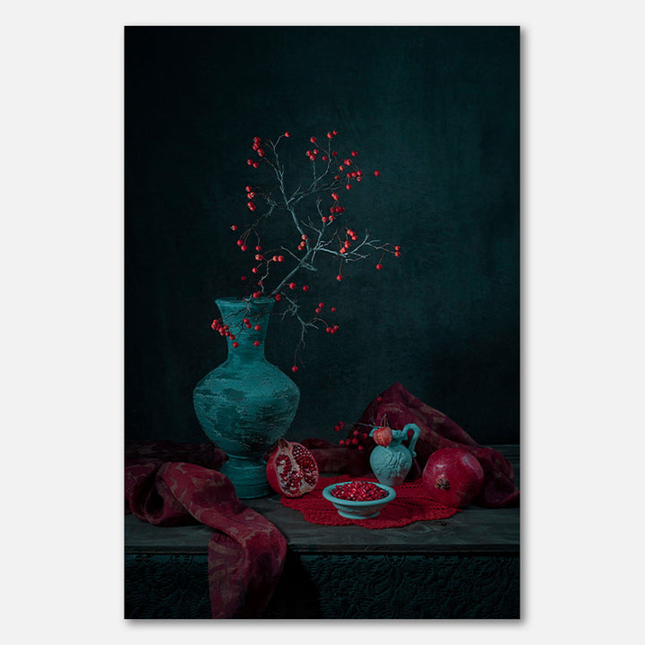 This painting exudes a wonderfully fresh atmosphere with juicy pomegranates and berries that come perfectly to life on the table. The wall decoration fits beautifully with interiors featuring a modern, rustic, or Scandinavian style and instantly makes any space feel warm and inviting.