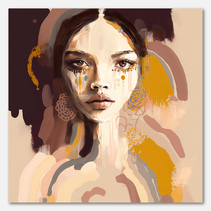This painting exudes a warm, contemporary atmosphere through the abstract portrait of a woman, framed by botanical flowers and leaves in soft brown and yellow tones. The wall decoration brings a multicultural and natural vibe to the home, perfectly suited to modern interior styles and culture enthusiasts.