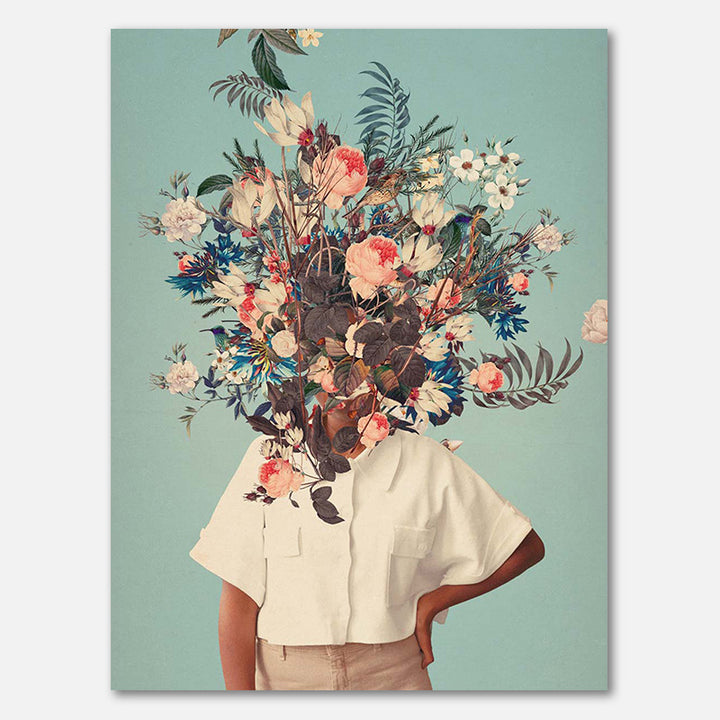 This wall decoration brings a dreamy mix of nostalgia and elegance into your home. Featuring a surreal floral portrait in soft blue and pink tones, this artwork perfectly suits a retro interior or a trendy botanical living style. Ideal for those who love creativity and striking prints on the wall.