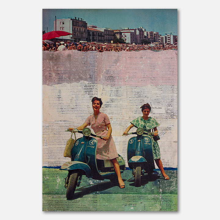 Two girlfriends during a beautiful summer vacation in Italy. I combine original photos, diverse paper, acrylic paint, charcoal, ink, ballpoint pen and pencil in my works. I have always had a great preference for weathered walls with peeling paint and old weathered posters. I use this as inspiration for my art. The creative goal of my work is 'making something beautiful with old and used materials'. Many small details will be visible if the work is printed in a larger size!
