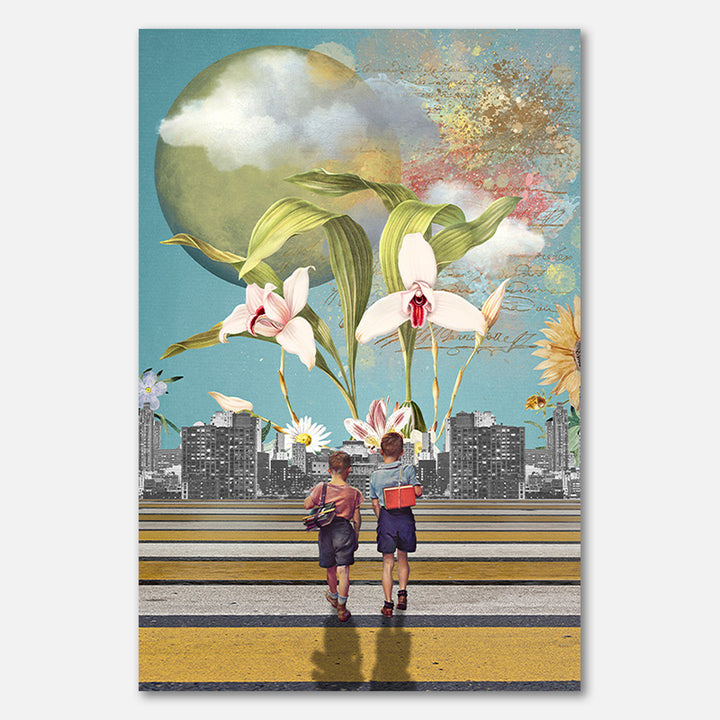 Collage of various vintage images. About how magical (and sometimes a little creepy) our youth was. 2 children, on their way to school, in a surreal landscape.