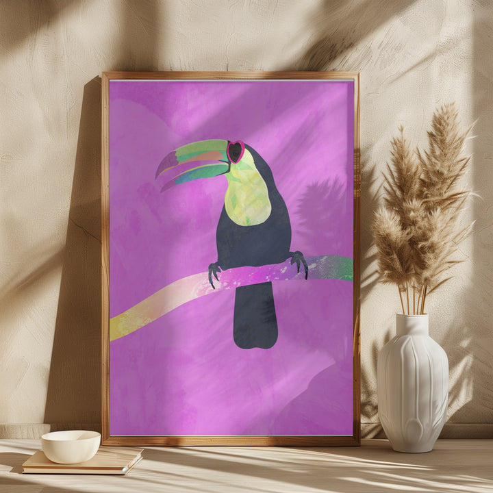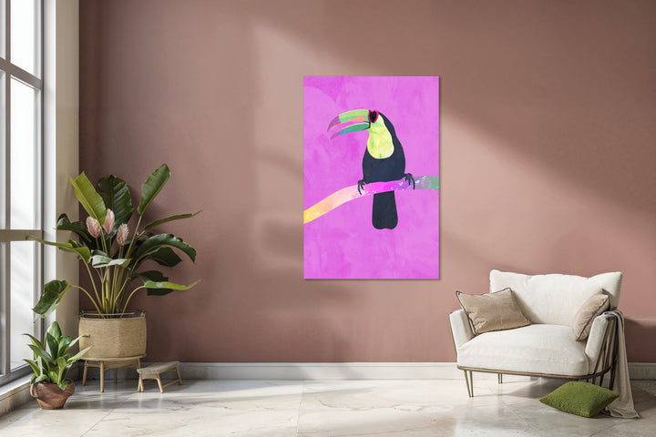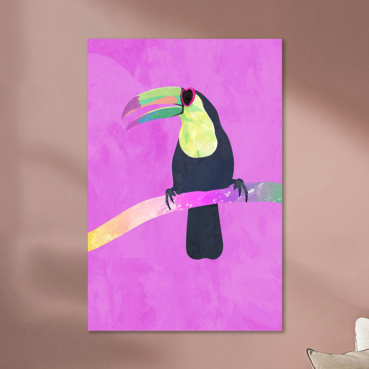 This painting brings a tropical touch to your home with a colorful toucan surrounded by vibrant shades of pink and rainbow. Perfect for a playful children's room, a cheerful living room, or a jungle-themed interior, this wall decoration radiates energy and exotic charm and instantly puts a smile on your face.