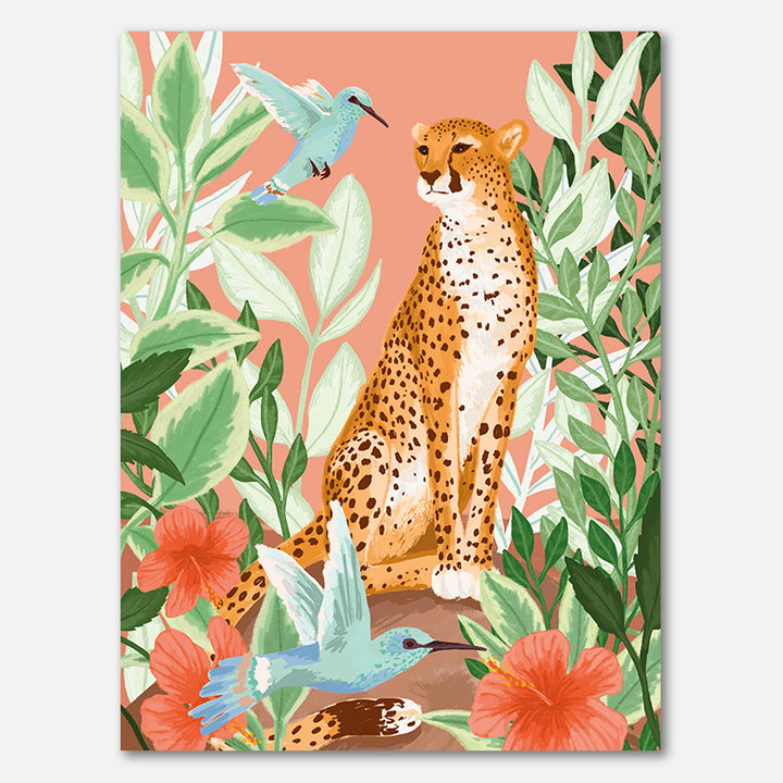 This wall decoration brings an exotic atmosphere into your home with a playful cheetah among colorful flowers and tropical leaves. Perfect for an interior with botanical or jungle influences, but also a fantastic eye-catcher in children's rooms. Make your space stand out with this lively, colorful painting full of nature and animals.