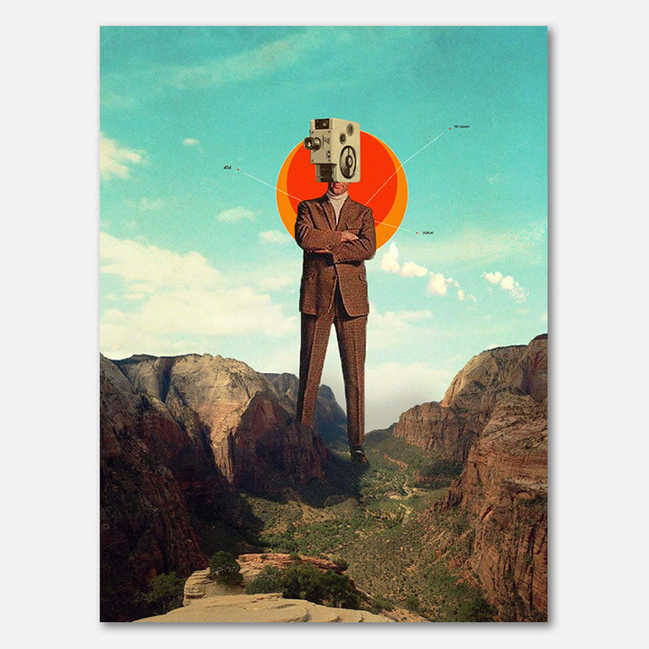 This wall decoration takes you to a surreal world full of retro vibes. The digital artwork shows a man in a suit under a blue, cloudy sky, with a vintage camera and sprawling green fields. Perfect for an interior with vintage aesthetics, retro style, or a creative, modern twist.