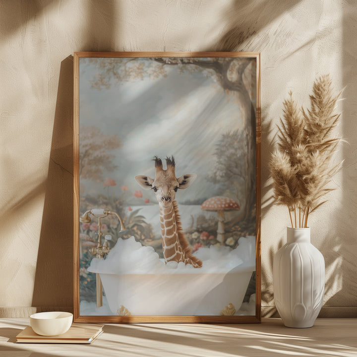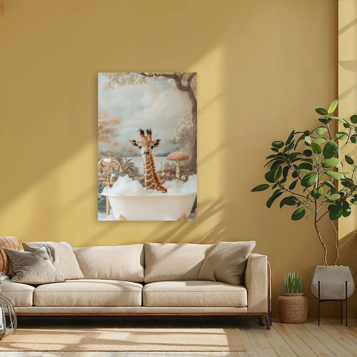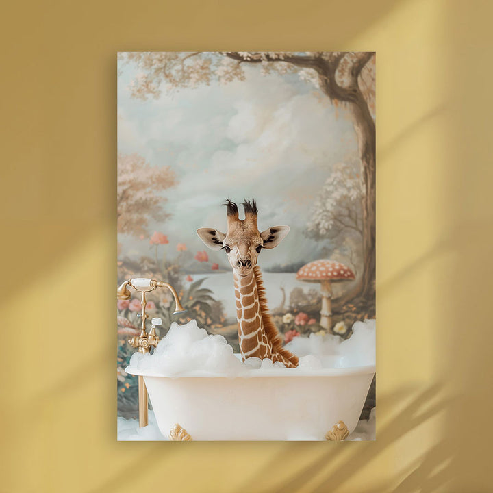 This cheerful wall decoration brings a playful twist to any room with a baby giraffe enjoying a delightful bath moment. Perfect for the nursery, the bathroom, or as a subtle cheerful touch in a neutrally decorated bathroom. This painting gives any wall a warm, imaginative look and fits perfectly with modern and cozy interiors. Let yourself be inspired by this unique eye-catcher that makes both young and old smile!