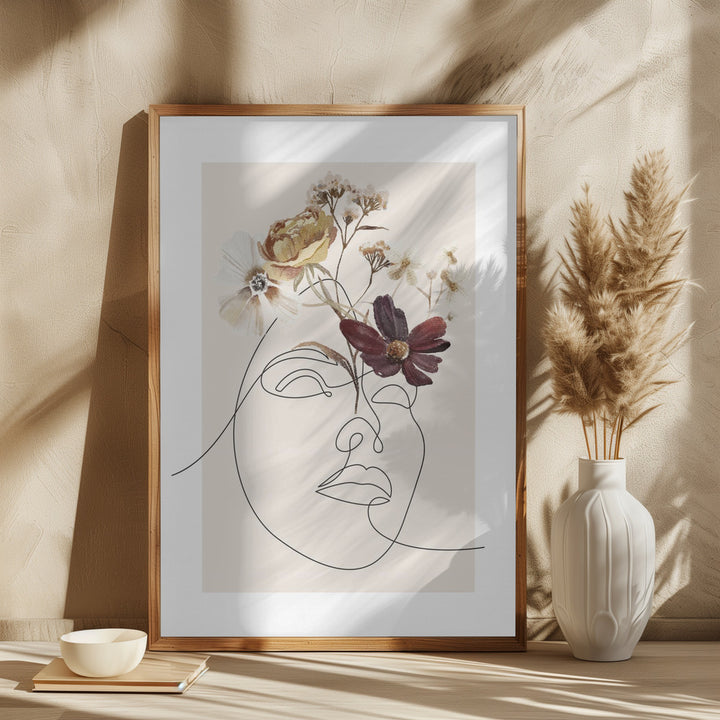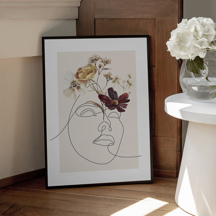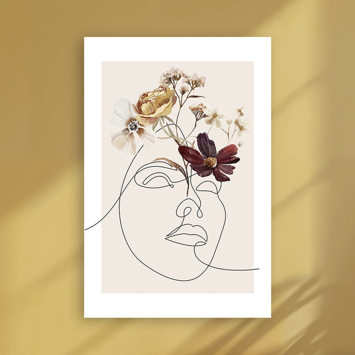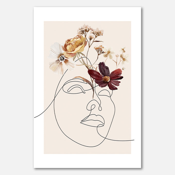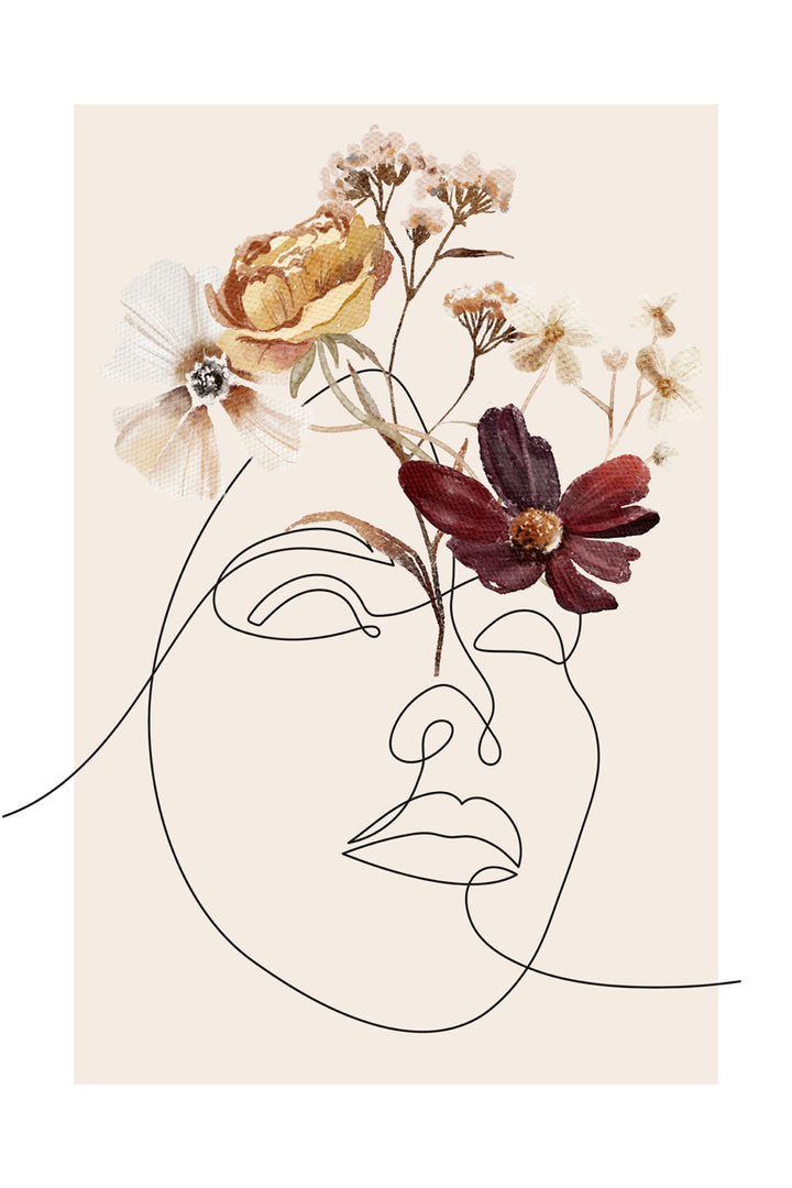 This painting subtly combines a feminine face with floral botanical elements in playful line drawings. Ideal as wall decor for a modern, Scandinavian, or bohemian interior, it brings a fresh and stylish look to any space. Add an artistic statement to your living room or office!