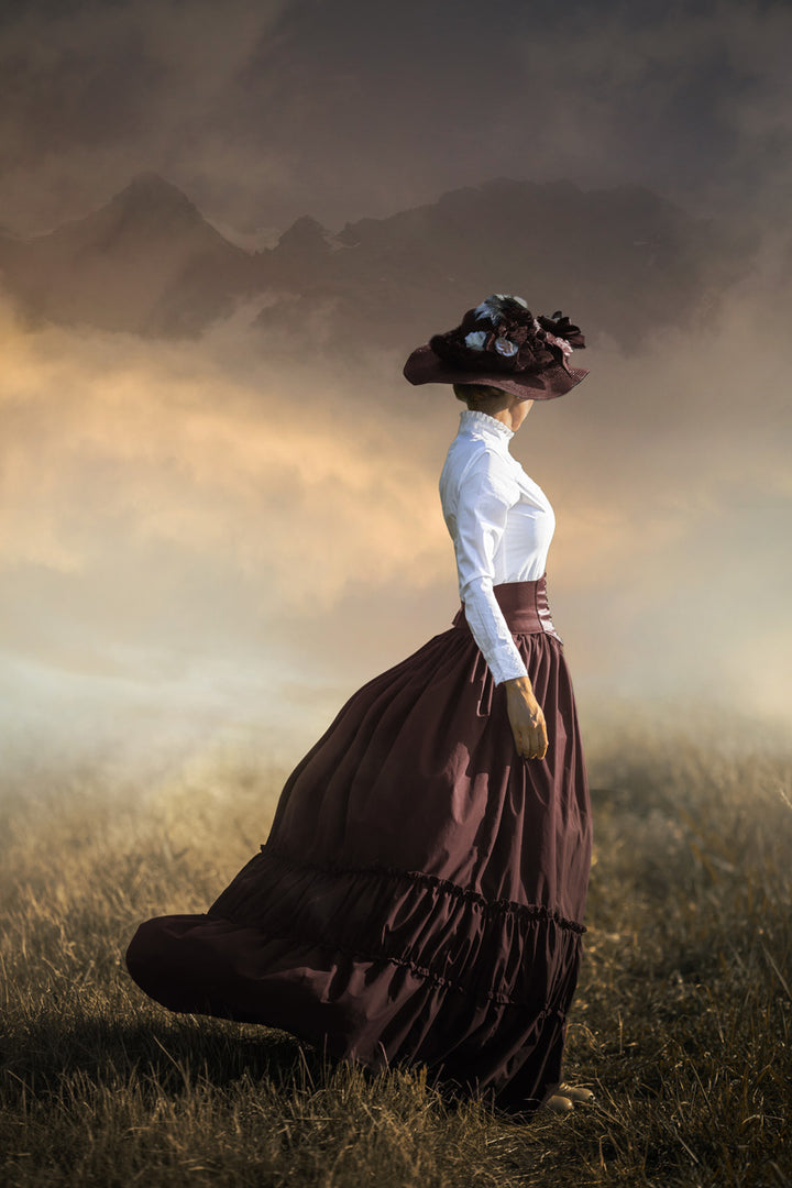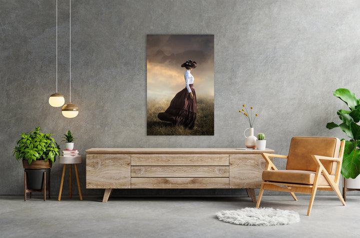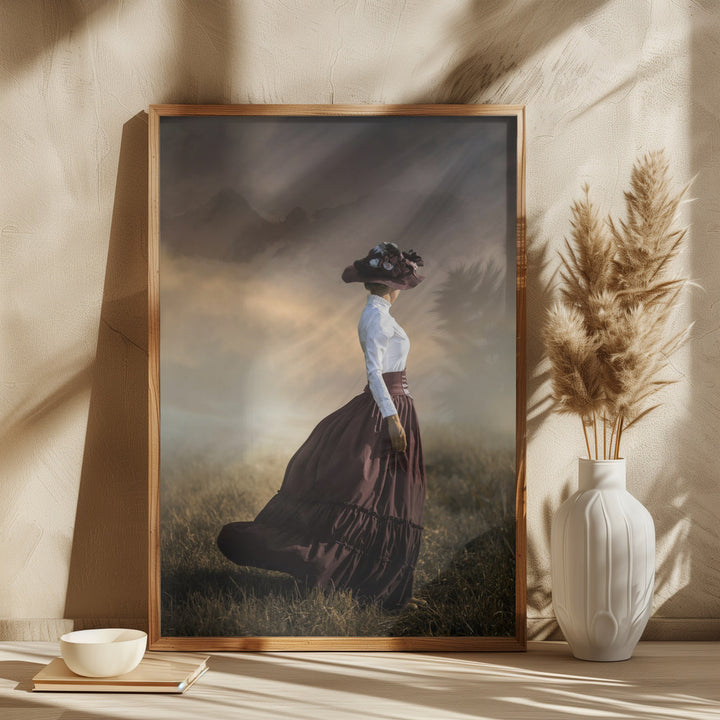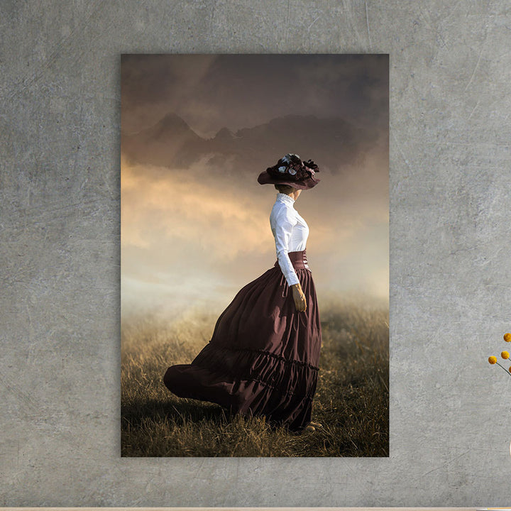 This painting brings the atmosphere of a misty landscape to life, where a woman in a retro dress and hat anonymously wanders through the vast fields. The nostalgic and dreamy appearance gives a warm and vintage feel to your interior. Perfect wall decoration for rustic, classic, or creative living styles.
