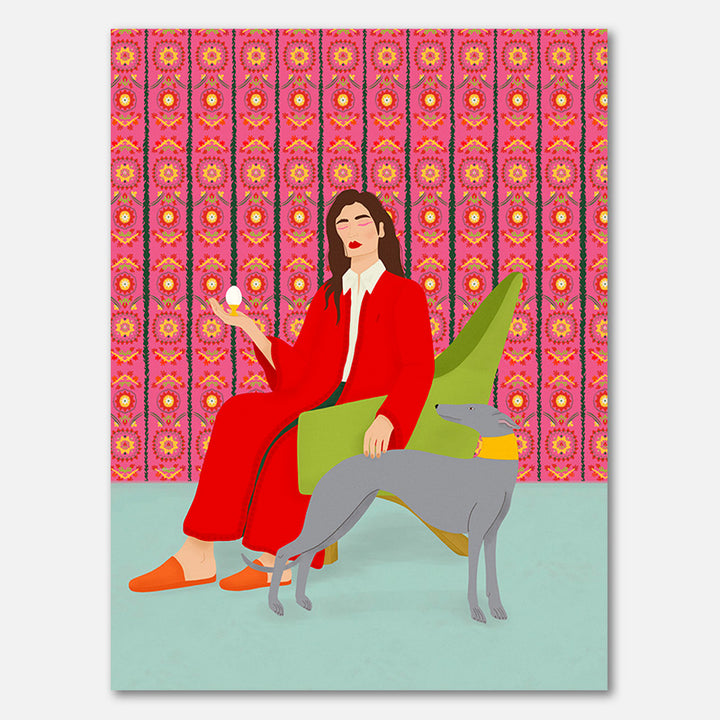 This wall decoration lets you daydream with a dreamy woman, an elegant greyhound, and a mysterious egg together in a colorful, abstract setting. Perfectly suited for modern interiors with a touch of kitsch or a minimalist style that needs a playful accent.