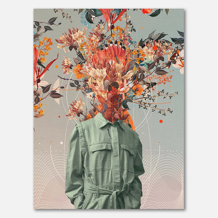 Be enchanted by this retro-inspired, surreal wall decoration where a woman and botanical flowers merge into a creative portrait. This artwork brings a mysterious, abstract atmosphere with geometric shapes and patterns, making it a perfect fit for modern, minimalist, or eclectic interiors. You instantly create a contemporary and atmospheric look in any space.