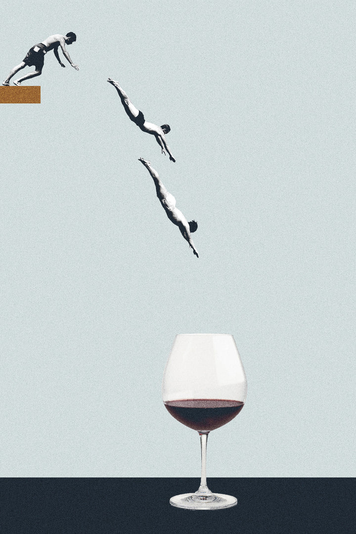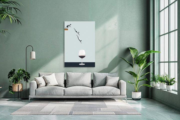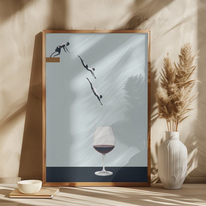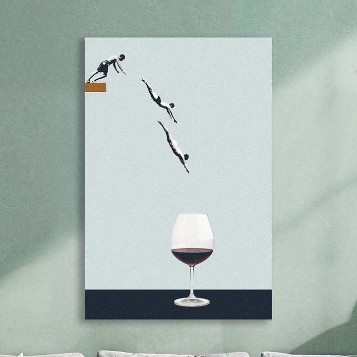 This painting playfully captures the surreal moment when friends enjoy wine and adventure together, making you forget that time is passing. The creative montage with divers and wine fits perfectly in interiors with a mid-century, creative, or modern style, and always brings a smile to your living room.