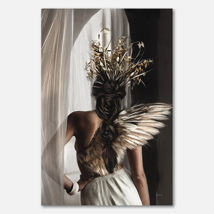 Ave - een goddelijke poster in neutrale kleuren met gouden details! Ave staat met haar rug naar je toe, maar straalt kracht uit. De jurk met veren lijkt misschien op een vleugel en de creatie in het haar lijkt op een gouden kroon.