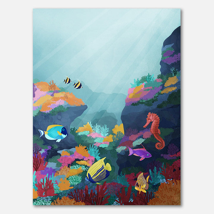 Deze kleurrijke wanddecoratie neemt je mee naar een onderwaterwereld vol scholen vissen en levendige koraalriffen. Het schilderij straalt avontuur en natuur uit, waardoor het perfect past in een speelse kinderkamer, een moderne woonkamer of elke ruimte die verlangt naar een frisse, oceaanachtige sfeer.