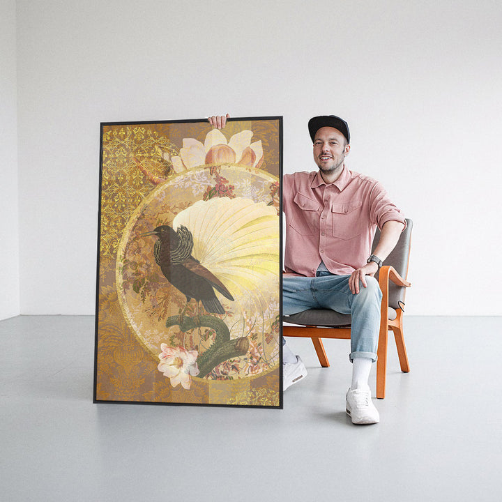 Een betoverend kunstwerk vol detail en elegantie. De zwarte paradijsvogel schittert te midden van gouden patronen en weelderige bloemen, waardoor een luxueuze en exotische sfeer ontstaat. Perfect voor interieurs die warmte, natuur en verfijning willen uitstralen.