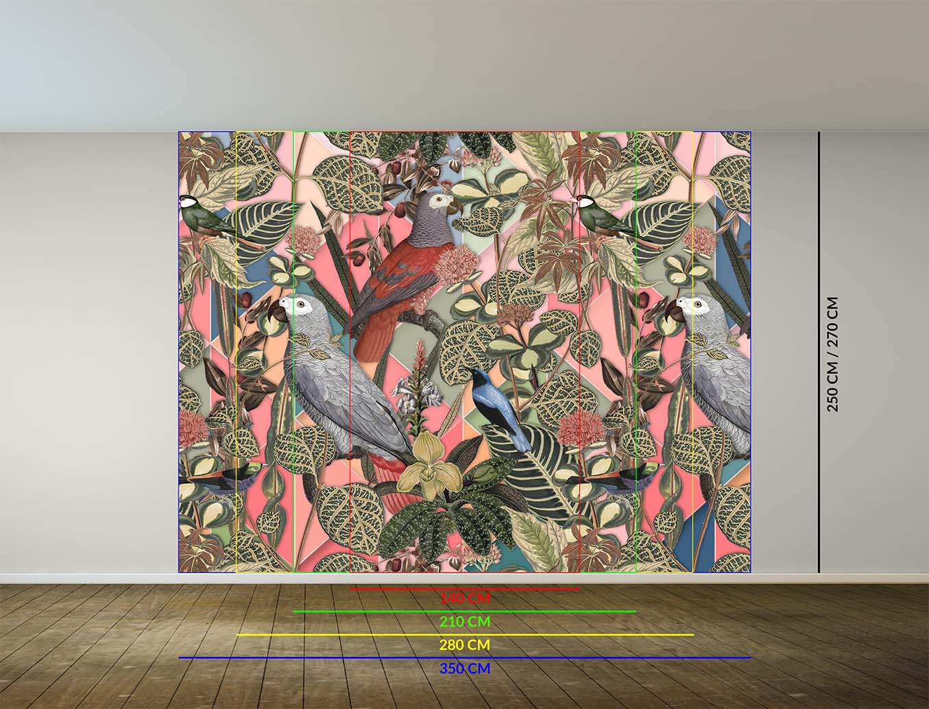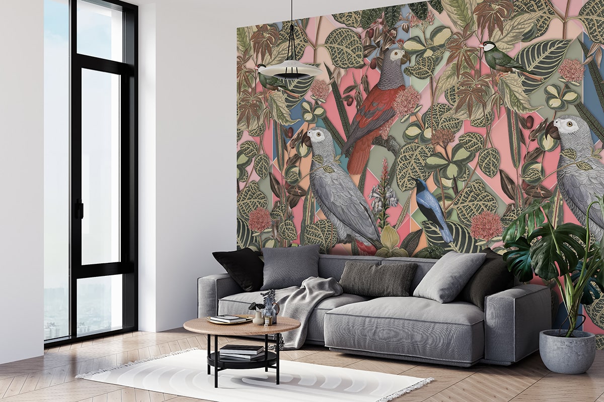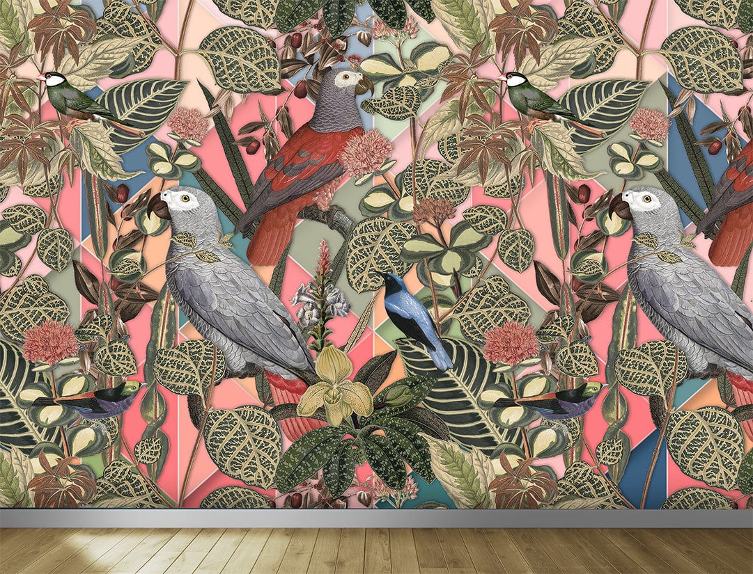 Een vrolijk en tropisch tafereel voor aan de muur. Door het toepassen van schaduwen en door sommige gedeeltes te vervagen, ontstaat er een 3D-effect in dit kunstwerk.