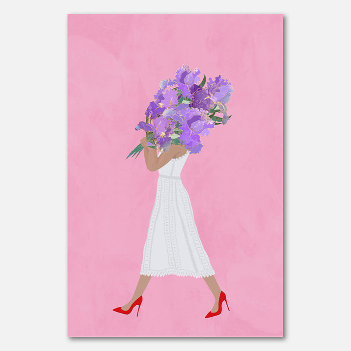 Deze wanddecoratie brengt een zomerse boho sfeer in huis, met een stijlvolle vrouw in een bloemenjurk die doet denken aan een zonnige wandeling over een Italiaanse markt. Het schilderij past perfect in een botanisch of modern interieur, en voegt een vleugje vrouwelijke elegantie toe aan iedere ruimte.