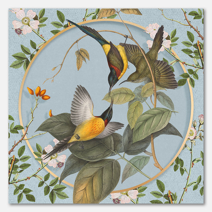 Vogels, planten en bloemen op een vergrijsd blauwe achtergrond, met een rond gouden frame.
