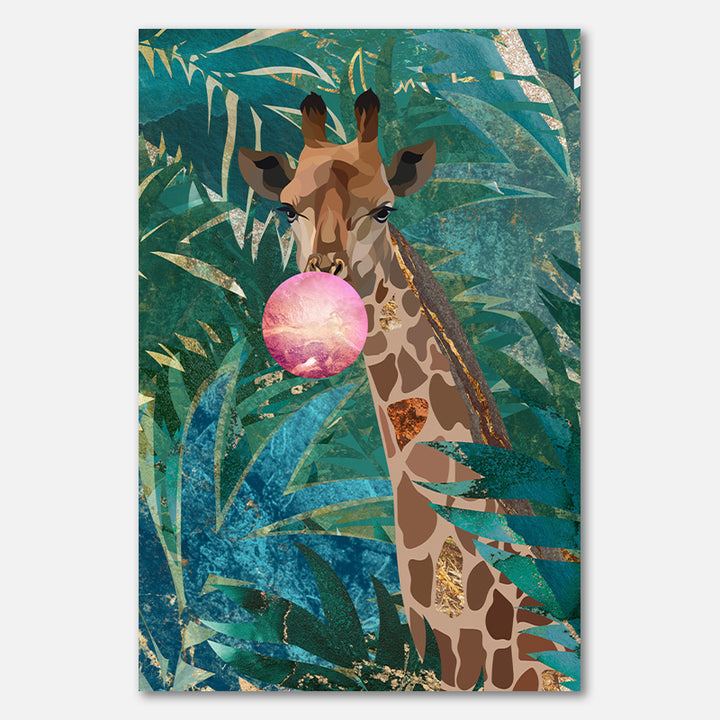 Dit vrolijke schilderij brengt een exotische giraffe met bubblegum tot leven tussen tropische bomen en gouden tinten, wat meteen warmte en speelsheid aan je interieur toevoegt. De kleurrijke wanddecoratie past perfect bij een moderne, kinderlijke of eclectische stijl en brengt het gevoel van de jungle direct naar je woonkamer.