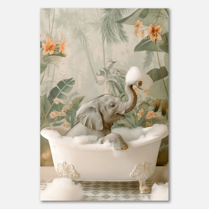 Dit vrolijke schilderij brengt een schattige baby olifant tot leven, omringd door groene en oranje tinten en speelse bubbels. Perfect als wanddecoratie voor de kinderkamer of een frisse look in de badkamer, voegt dit kunstwerk een speelse en rustgevende sfeer toe aan ieder interieur.