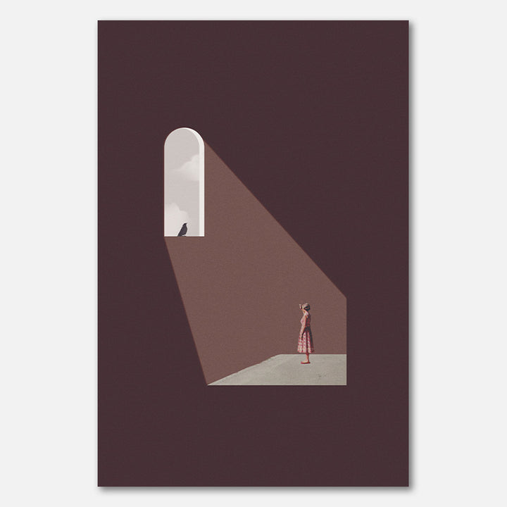Dit schilderij brengt een unieke sfeer in huis met een speelse mix van licht en schaduw, waarin een mysterieuze vrouw, vogels en een vleugje mid-century design samenkomen. Perfect als wanddecoratie voor interieurs die houden van een grafische, figuratieve stijl met een anonieme twist.