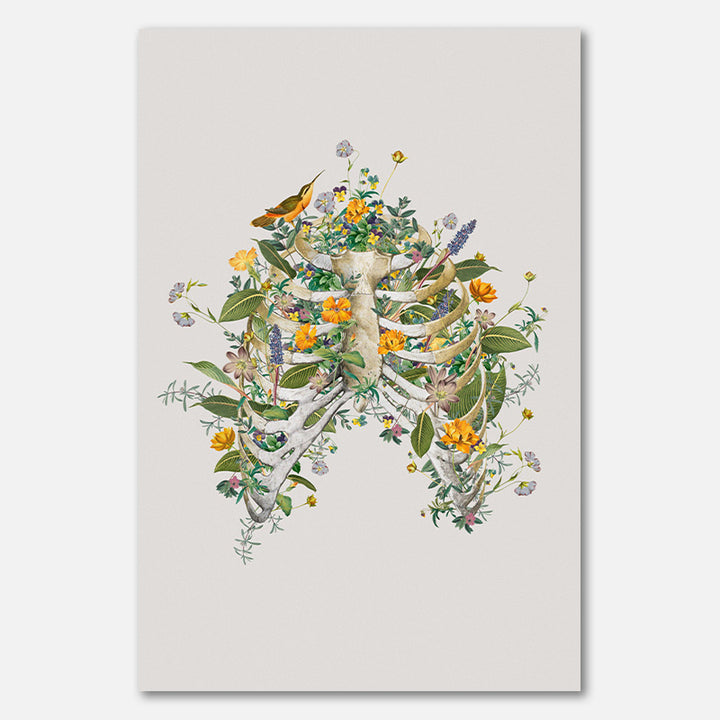 Dit schilderij combineert op surrealistische wijze anatomie en botanische elementen, waardoor een unieke en creatieve sfeer ontstaat. Perfect voor een licht en modern interieur, geeft deze wanddecoratie met felle bloemen en een witte achtergrond een frisse uitstraling en trekt direct de aandacht in elke ruimte.