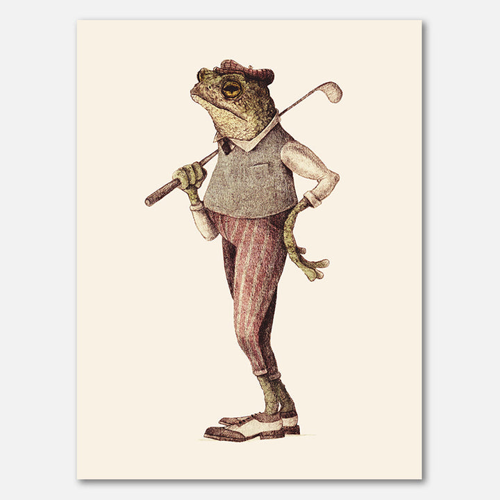 Dit schilderij brengt een charmante kikker in vintage golfkleding tot leven, vol humor en stijlvolle retro vibes. De wanddecoratie past perfect in een interieur met een vleugje jaren-oude elegantie, ideaal voor wie houdt van sportieve, eigenzinnige en unieke accenten aan de muur.