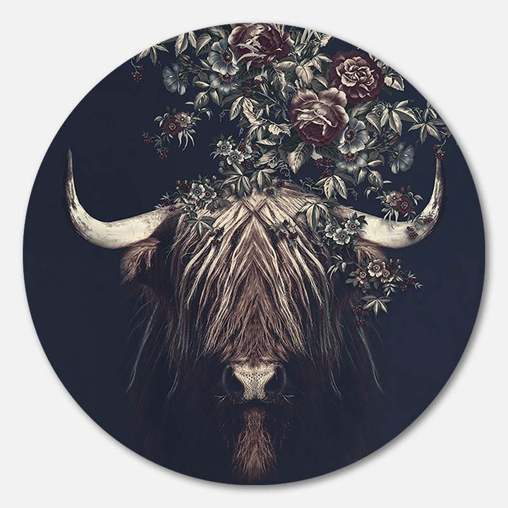 Deze wandcirkel brengt de stoere charme van een Schotse hooglander subtiel tot leven, terwijl kleurrijke bloemen de rustieke sfeer versterken. Ideaal voor een landelijk of modern interieur waarbij natuur en karakter samenkomen. Dit schilderij geeft warmte aan elke ruimte en is een echte eyecatcher.