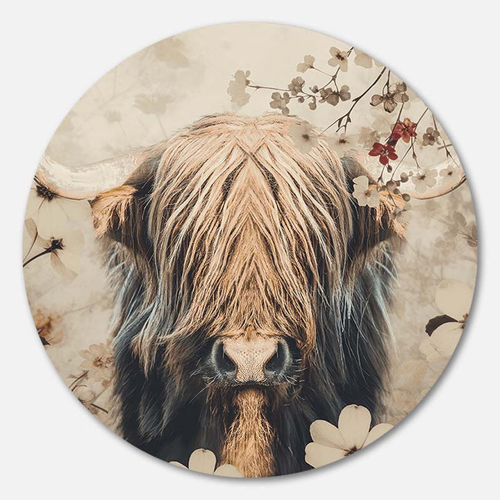 Deze prachtige ronde wanddecoratie toont een Schotse hooglander die dromerig tussen de bloemen staat, perfect voor liefhebbers van natuur en dieren. Het warme kleurgebruik en de speelse vormen brengen een rustgevende sfeer in elke ruimte en staan fantastisch in een landelijke of moderne inrichting. Geef je interieur een stijlvolle, unieke uitstraling met deze kunstzinnige muurcirkel.