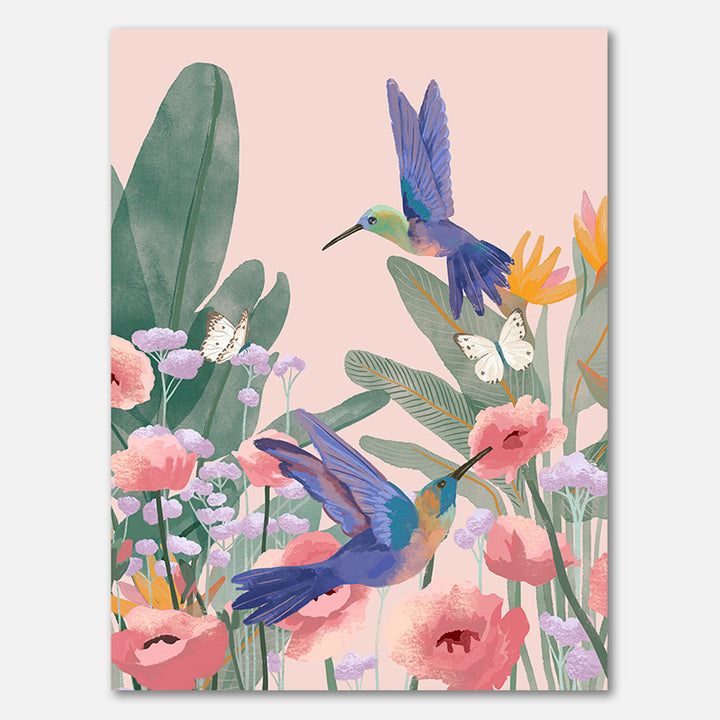 Dit schilderij laat kleurrijke kolibries tussen exotische bloemen en bladeren zien, perfect voor wie een vleugje natuur en tropische sferen in huis wil halen. Met de levendige illustratie past deze wanddecoratie in zowel een moderne als een botanische inrichting en brengt hij elke ruimte tot leven.