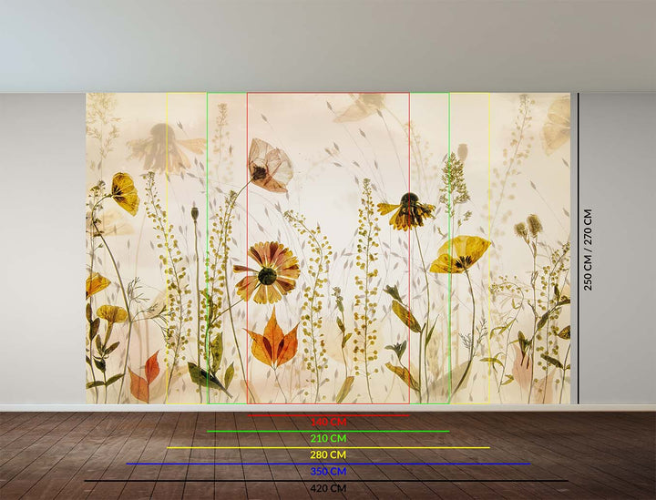 Met warme gele tinten en een creatief bewerkte dubbele belichting brengt dit behang een panoramisch landschap vol bloemen en gras tot leven. Het botanische dessin past perfect in lichte woonkamers en moderne interieurs, en voegt een vleugje abstracte rust toe aan elke ruimte waar je even wil wegdromen.