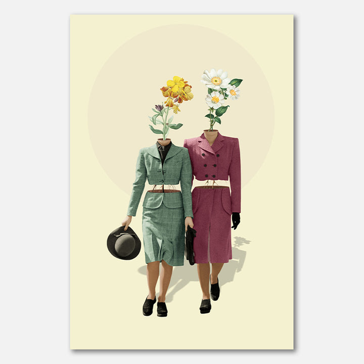 Humoristisch en surrealistisch kunstwerk met een vintage en botanische uitstraling.