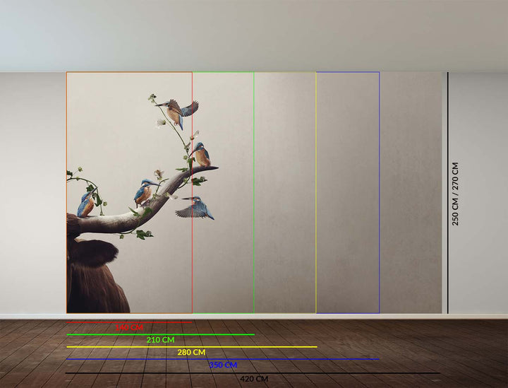 Deze muurbedekking vangt de levendigheid van een groep ijsvogels die sierlijk balanceren op de imposante hoorn van een stier, waardoor je direct een bijzondere sfeer aan je kamer toevoegt. Het behang past prachtig in interieurs met natuurlijke of bohemien thema’s, maar steelt ook de show in moderne en eclectische woonstijlen. Gemaakt van premium materialen zoals vliesbehang, vinylbehang, naadloos behang en akoestisch behang, zorgt deze eyecatcher voor een luxe uitstraling én een persoonlijke touch aan elke ruimte.