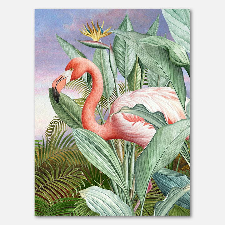Digitaal vervaardigde illustratie. Een collage van diverse afbeeldingen. Portret van een roze flamingo in een tropisch landschap.