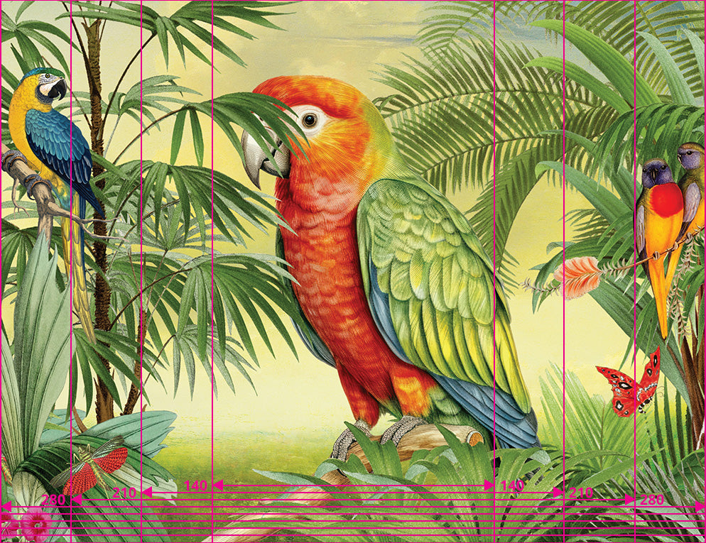 "De verlegen Papegaai". In een wonderlijk bos, hier ver, ver vandaan, samen met parkieten, kaketoes, andere papegaaien, insecten en vlinders, woont deze verlegen papegaai. Hij verstopt zich het liefst achter bomen en planten, maar zijn oranje verentooi werkt daarbij helaas in zijn nadeel.. Dit is een collage van diverse (vintage) botanische afbeeldingen, een vrolijke en tropische explosie van kleuren.
