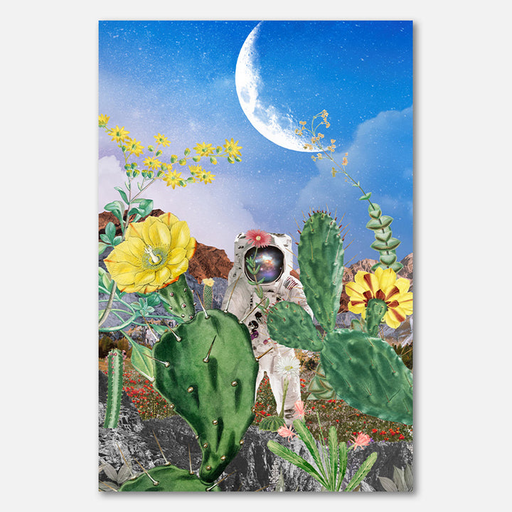 Portret van een astronaut, geland op een planeet hier ver, ver vandaan, waar het landschap gevuld is met cactussen in bloei en glooiende heuvels.
