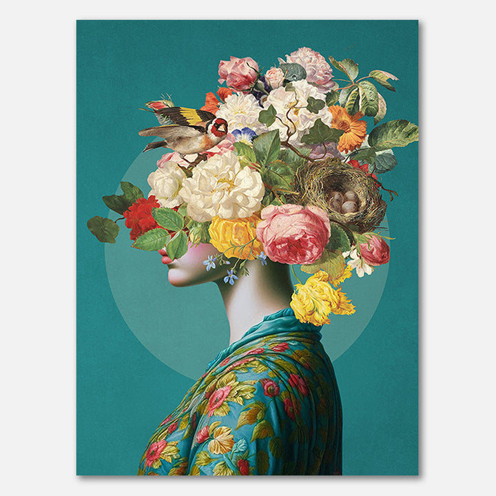 Een lenteachtig, zomers, retro, vrolijk, kleurrijk romantisch en ietwat onwaarschijnlijk portret van een vrouw met een hoofdtooi van bloemen, een vogel en een vogelnestje. Dit is een digitaal samengestelde collage, op een turquoise achtergrond.