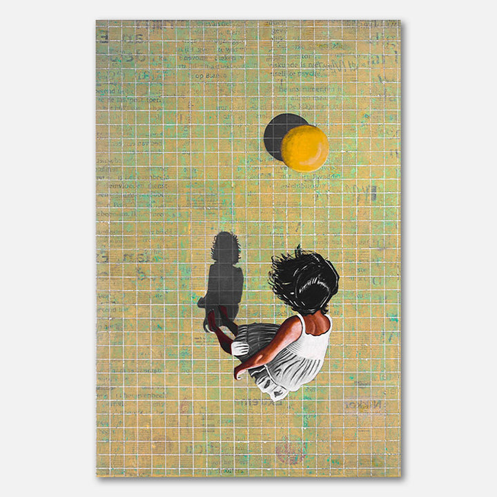 Het originele schilderij is een Mixed Media / Collage kunstwerk op canvas, 100 x 70 x 2 cm. Gemaakt met lagen papier op een manier waarbij tekst en letters zichtbaar blijven. Daar overheen is acrylverf aangebracht in een transparante laag. Tot slot heb ik het meisje met de bal daar op geschilderd.