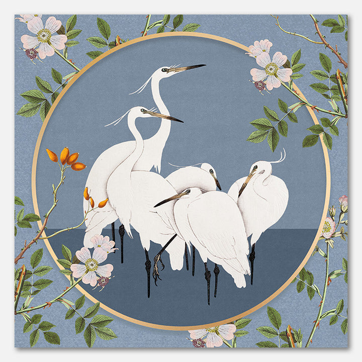 Dit is een collage van diverse vintage illustraties, met een hoofdrol weggelegd voor een groepje zilverreigers, staand in water. De afbeeldingen van de prachtige vogels zijn vervaardigd door de Japanse kunstschilder en prentkunstenaar Ohara Koson (1877 - 1945).