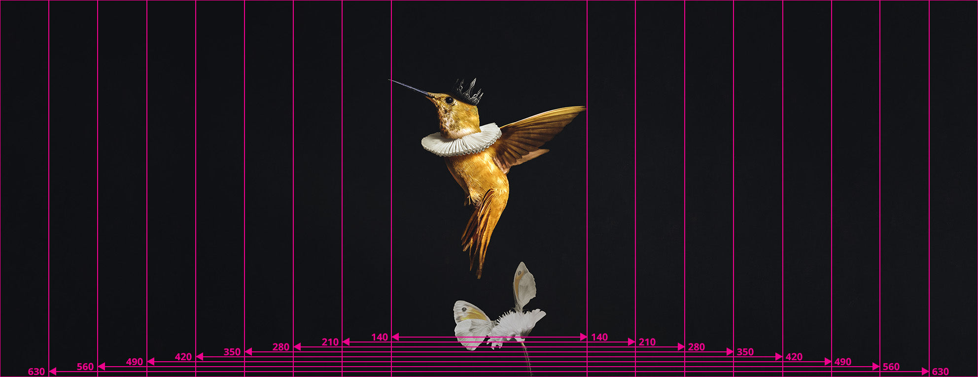 Posters: 148 x 148 cm | Alu-dibond: 150 x 298 cm | Plexiglas: 150 x 298 cm | Textielframe: 240 x 308 cm | Akoestisch paneel: 160 x 260 cm.