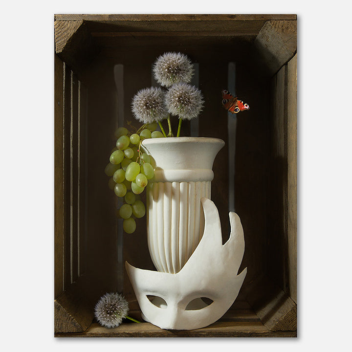 Stilleven met paardenbloemen in de van oude meesters. "Toen ik dit beeld wilde maken moest ik denken aan transformatie van het leven, het masker die je even kan transformeren in iemand die je normaal niet bent en dat symboliseert de paardenbloemen in dit stilleven ook." Een prachtige wanddecoratie met diepte in de schoonheid van het stilleven met de sfeer van de oude meesters.