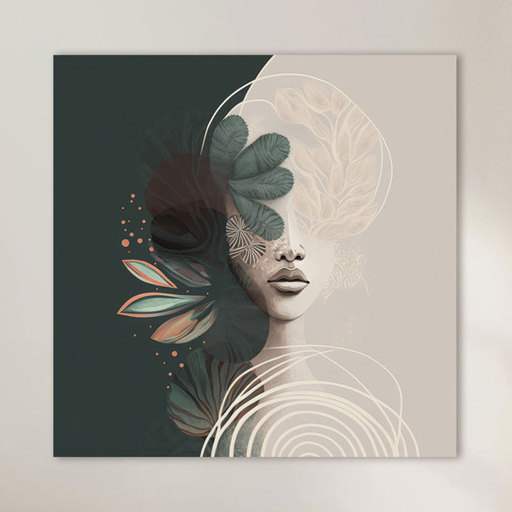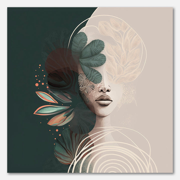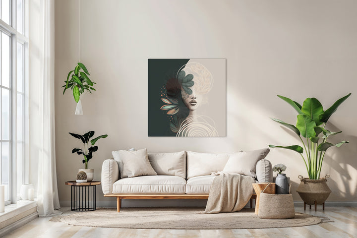 Dit schilderij straalt een warme, eigentijdse sfeer uit met abstracte lijnen en prachtige botanische details in beige en groene tinten. Ideaal voor wie houdt van multiculturaliteit, vrouwelijkheid en de schoonheid van de natuur aan de muur. Deze wanddecoratie past perfect bij moderne en botanische interieurs.
