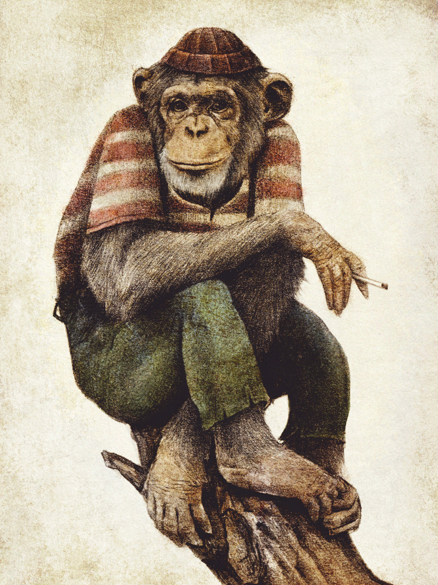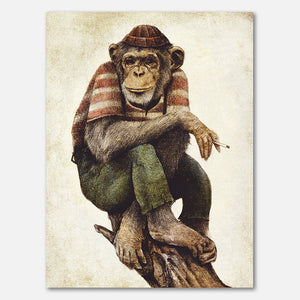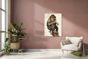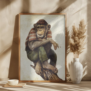 Deze wanddecoratie brengt een ontspannen chimpansee tot leven in een stijlvolle retro stijl met sepia tinten. Perfect voor wie houdt van humor en vintage vibes, past dit schilderij moeiteloos in zowel een moderne als een retro inrichting. Het geeft iedere ruimte een eigenzinnige, relaxte sfeer en laat elk interieur spreken.