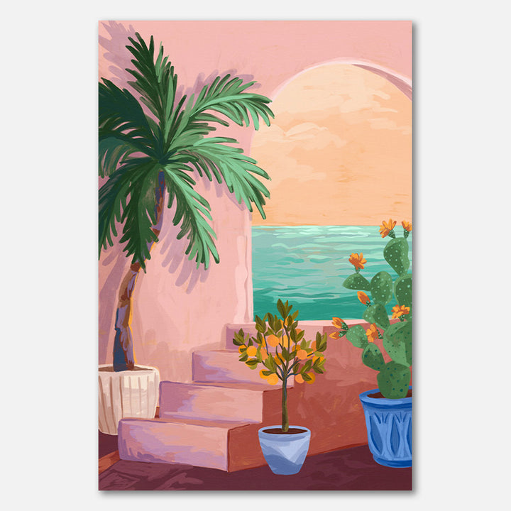 Deze wanddecoratie brengt een tropische en exotische sfeer in je interieur, met felgekleurde bloemen, palmbomen en een vleugje zee voor een zomerse vibe. Ideaal voor botanische of moderne woonstijlen, past dit schilderij prachtig in de woonkamer, keuken of een lichte hal waar natuur en paradijs centraal staan.