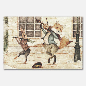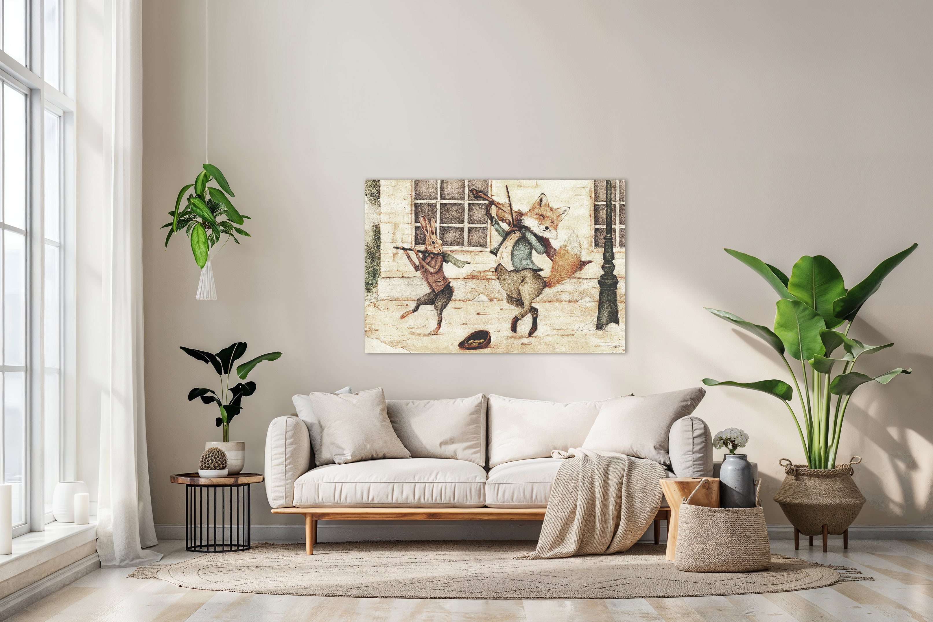 Deze wanddecoratie brengt je naar een winterse stad vol muzikale dieren die samen het plezier van muziek vieren. Perfect voor liefhebbers van fantasie en retro vibes, voegt dit schilderij een vrolijke, vintage sfeer toe aan kinderkamers of gezellige hoekjes waar speelsheid en creativiteit centraal staan.