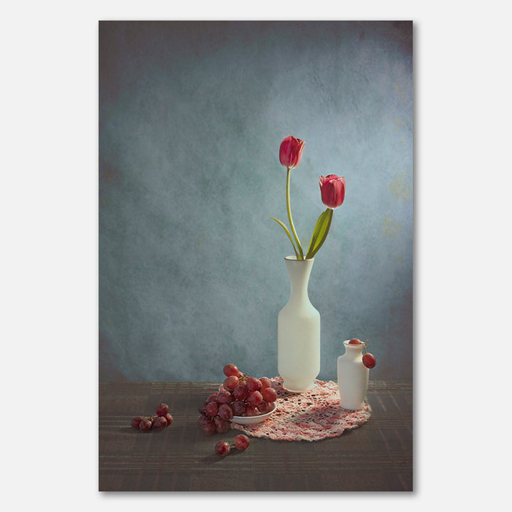 Deze wanddecoratie brengt een vrolijke sfeer in huis met sappige druiven en bloemrijke details die doen denken aan een idyllisch stilleven. Perfect passend bij botanische thema’s, een landelijke keuken of een moderne woonkamer. Geef je interieur een frisse en uitnodigende uitstraling met dit schilderij.