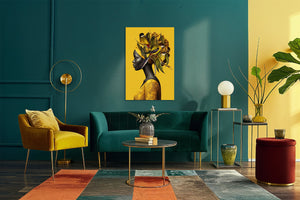 Veel geel, goud, vogels en zomerse vrolijkheid in dit digitaal vervaardigde portret. Dit is een collage van verschillende afbeeldingen die samen een tropisch en bijzonder schilderij maken. Klik op de afbeelding om de fijnere details van dit unieke werk te kunnen bekijken.